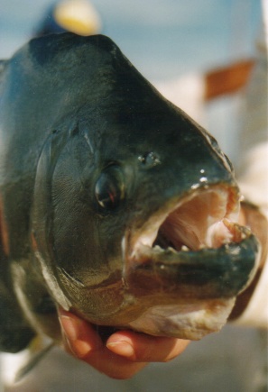 彼らはやや中層以下の深みを好むといいますが、ヒザほどの水深の浅瀬にまで弁当の残飯を漁りに来たりもしましたから、どこであれ油断は禁物です。水あるところにピラーニャはおり、‘その瞬間’を狙って息をひそめています。そんなこと知らない僕、誤ってボートからペンチを落とした際、水浴びを兼ねてパンツ一丁で潜って拾ってきました。が、後でピラーニャのことを学ぶにつけ、ちょっと背筋が寒くなってしまいました。(そやから先に言うてください〜!)