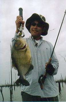 この魚を釣るのは簡単。まずエサ釣りなら、角切りの魚肉を掛け、水底に降ろすだけ。僕らが体験した限り、10秒以内に彼らは来ます。カミソリが肉片を切断する微妙な感触のあと、重みがかかったような感触がくればそれが本アタリ。思いきりアワセてやります。